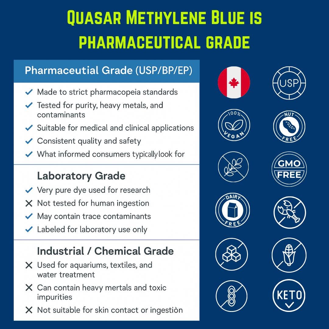 ULTRA HIGH PURITY: Our Methylene Blue is of 99.995% purity and made in a strict GMP facility.